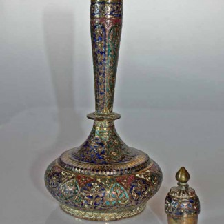A richly decorative piece. The gilding is worn at the neck and around the body, and the bottle lacks the chain linking stopper and body but the overall condition is excellent.