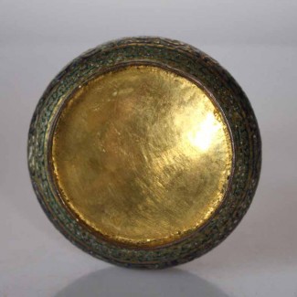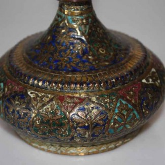 Although a traditional form, this piece is typical of the kind of Indian craft metalwork imported in significant quantities into Britain, being retailed by shops such as Liberty’s and exhibited in the international exhibitions of the ‘industrial arts’ in the late 19th and early 20th centuries.