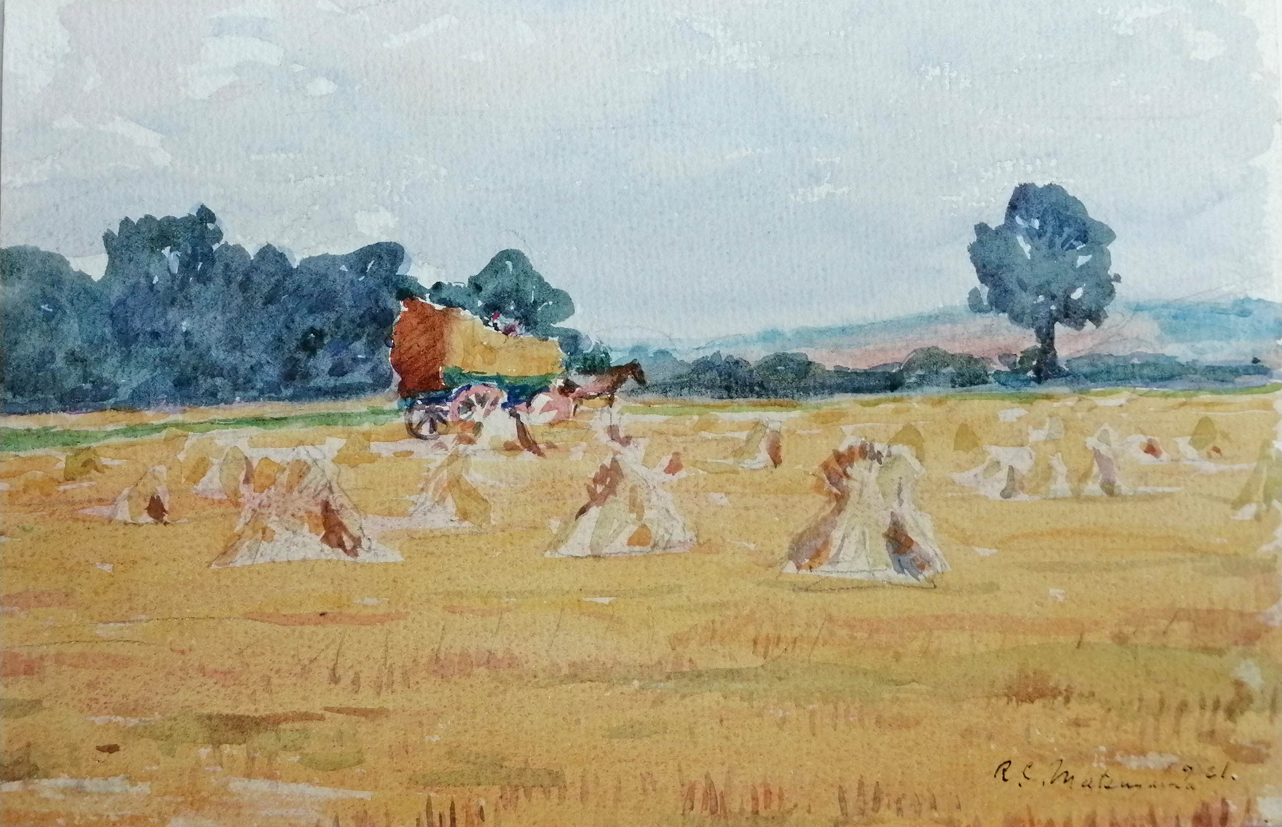 a: Corn Stooks and Harvest Wagon, 155 mm x 232 mm; watercolour on cream paper, signed and dated, bottom right R C Matsuyama 1921. Verso with tape residue at the corners and cropped inscription, – 21 / gnor, suggesting that the scene might have been painted above Bognor Regis.